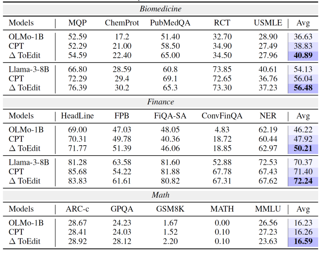 持续预训练阶段(Continual Pre-training):在生物医药、金融、数学等专业任务中,Token-Level Editing 带来了跨域的泛化提升。例如在 PubMedQA 任务中,准确率提升高达 +13.6%。