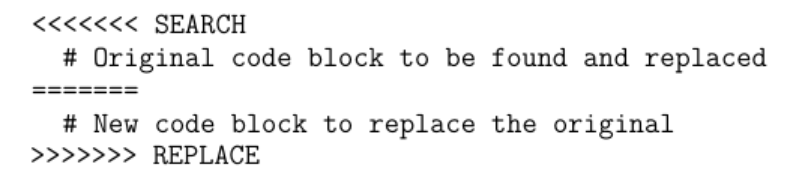 其中,位于 <<<<<<<SEARCH 和 ======= 之间的代码是当前程序版本中需要精确匹配的原始片段;而 ======= 与>>>>>>> REPLACE 之间则是新的代码片段,用于替换原片段。