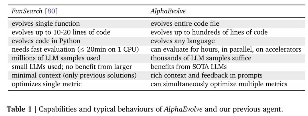 表 1 展示了 AlphaEvolve 与先前的 agent 的能力和典型行为上的对比。