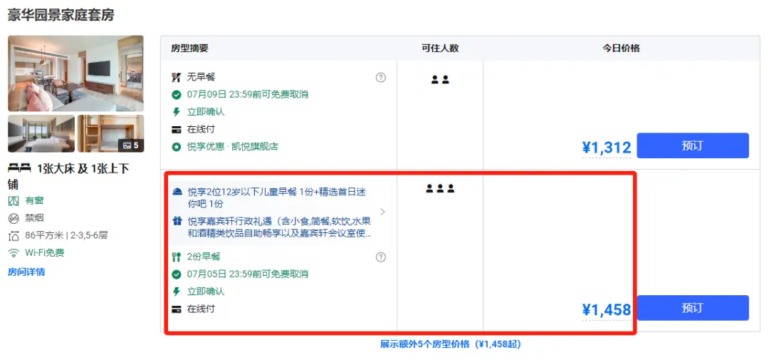 重点是套餐给了豪华园景家庭套房,房间面积86平米。