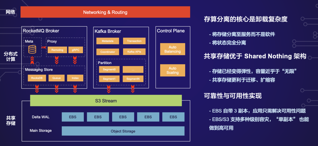 但在云上,云存储 EBS 已经自带 3 副本了,如果上层应用继续采用复制的方案,将带来 9 副本的数据冗余,以及多倍的存储和网络成本。所以,在 Kafka 和 RocketMQ 层面没有必要自己实现 3 副本。另外,EBS 是第二大存储系统,仅次于第一大存储系统 S3,云厂商对 EBS 进行深入的软硬一体优化,把 EBS 客户端卸载到神龙 CIPU(智能网卡)通过硬件来做,EBS 客户端跟 EBS 服务器的通讯针对数据中心内低延时低丢包率的特点实现自定义的传输协议而不是用 TCP,这些软硬一体优化带来的效果远远好于自己搭建的 3 副本高可靠系统。还有,在云上使用 EBS 来存储不消耗网络带宽,自建的 3 副本复制会大量消耗网络带宽。