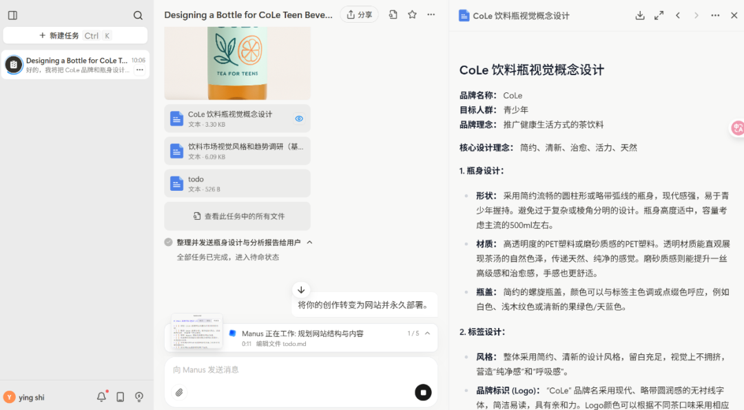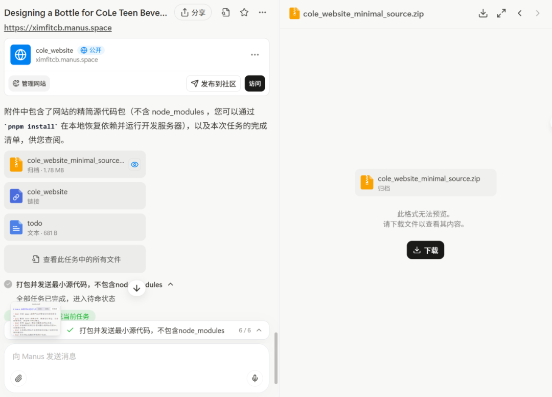 大约半个小时,Manus 终于成功部署了 CoLe 品牌网站。