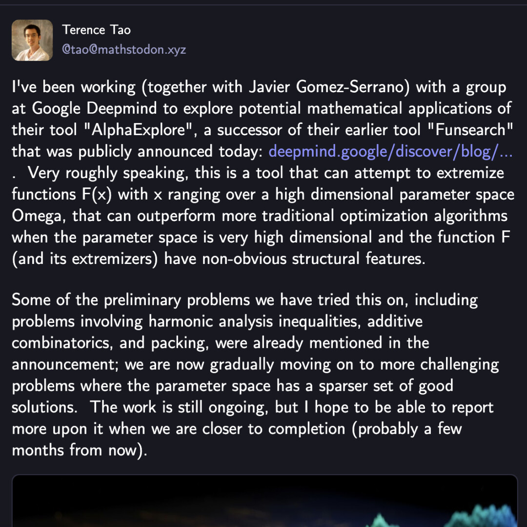 “我(与 Javier Gomez-Serrano 一起)正与谷歌 DeepMind 的一个团队合作,探索其工具 “AlphaEvolve”(其早期工具 “Funsearch” 的后续产品,该工具于今日公开宣布)在数学领域的潜在应用。大致来说,这是一种能够尝试对函数 F (x) 进行极值化的工具,其中 x 取值于高维参数空间 Ω。当参数空间维度极高且函数 F(及其极值点)具有非明显结构特征时,该工具的表现可能优于更传统的优化算法。