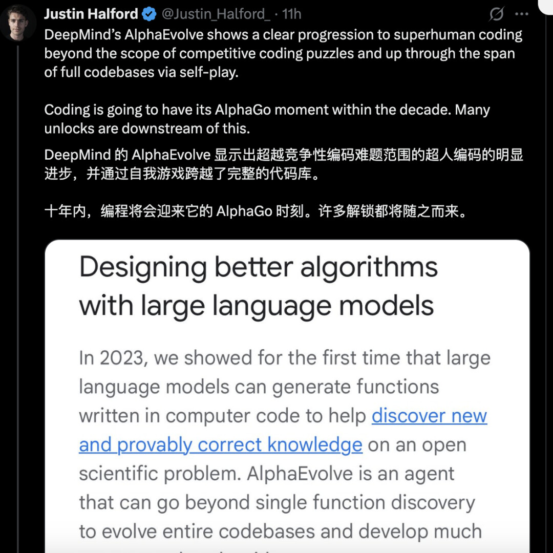 在 X 平台上,AI 初创创始人 Justin Halford 惊叹 AlphaEvolve 超人编码能力,并称编程将在 10 年内迎来它的 AlphaGo 时刻。
