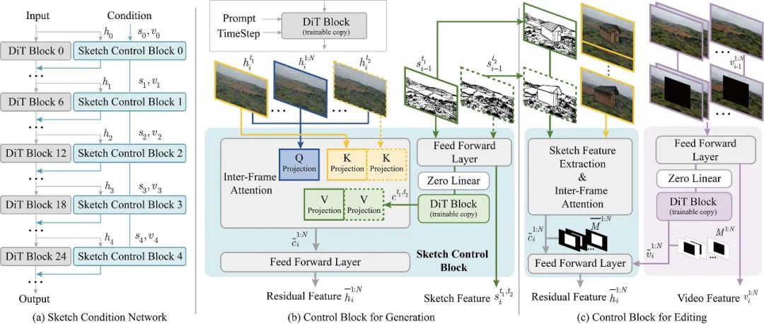 在视频生成阶段,用户可输入一帧或两帧关键帧线稿,并指定其对应的时间点,以控制视频在特定时刻的几何细节和视频整体的运动状态。为了将这些关键帧的控制信息有效传播至整段视频,该方法引入了帧间注意力机制(图 3 b):先通过一组由原始视频生成模型初始化的可训练 DiT 模块(DiT Block (trainable copy))提取关键帧的控制特征,再利用帧间相似性引导控制信号以稀疏方式向其他帧传播,最后通过前馈网络生成所有帧的残差控制特征,实现时序一致的线稿引导生成。