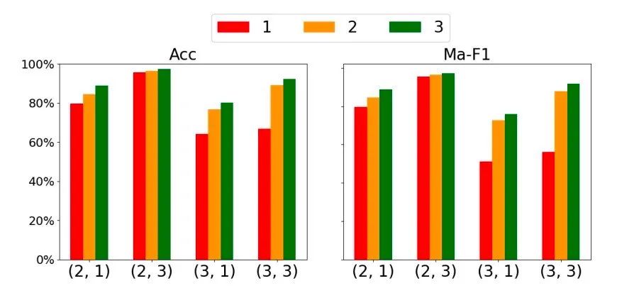 我们分析了源异质图数量变化对LMCH性能的影响。实验中使用的源异质图是随机选择的,以确保比较的公平性。如图2所示,随着源异质图数量的增加,语言模型能够获取更丰富的信息并提取更广泛的一般知识,模型性能有所提升。