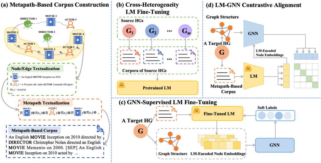 模型整体框架如图1所示。首先,为了统一异质图的表示并尽可能多的保留异质图中的信息,我们在图1(a)中设计了一种基于元路径的语料库构建方法,通过节点/边文本化和元路径文本化,将不同的异质图转换为语料库。然后,源异质图的语料库用于在图1(b)中微调语言模型,使LM能够从各种源异质图中获取通用知识。其次,为了利用标签稀疏的目标异质图中丰富的无标签节点信息,我们提出了图1(c)中的迭代训练流程,在该训练过程中,GNN为无标签节点生成软标签供LM微调使用,而LM编码的节点嵌入则作为GNN的输入。最后,为了在表示层面上对齐GNN和LM,在图1(d)中,我们在每个迭代过程结束时,采用LM-GNN对比对齐方法缩小它们的性能差距。