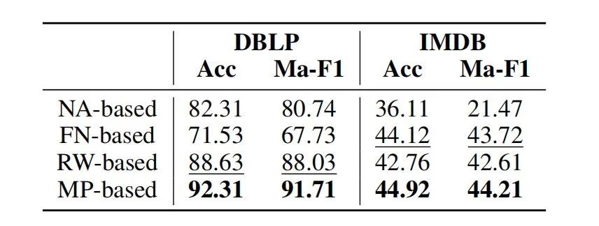 事实上,有多种方法可以用于语料库构建。我们分别评估了不同方法的影响,包括仅依赖节点属性的方法(NA-based);基于一阶邻居的方法(FN-based);基于随机游走的方法(RW-based);以及基于元路径的方法(MP-based),实验结果如表4所示。结果表明,基于元路径的方法优于其他方法。这证明了基于元路径的方法的确能够从图中提取尽可能多的信息,从而在目标图中实现更好的知识迁移。