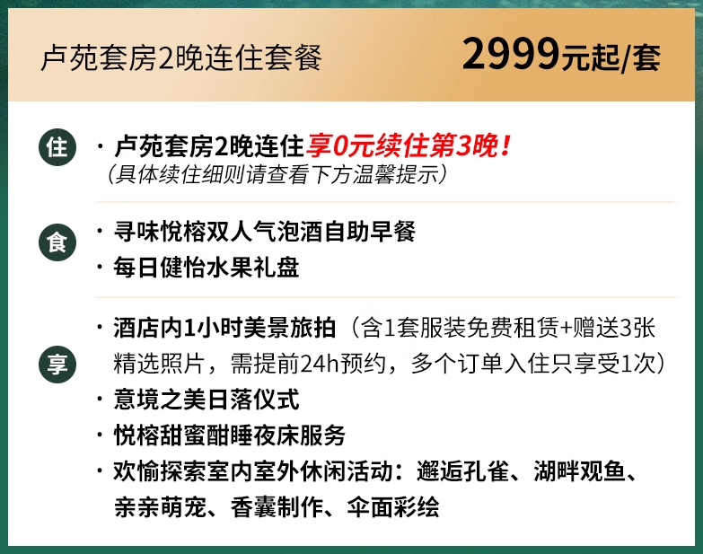 卢苑套房3晚含双早,2999元;联排别墅3晚含双早+双人下午茶1份,3999元。