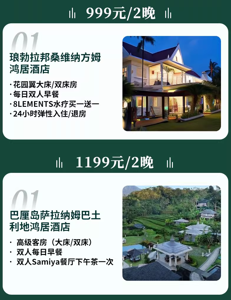 客房2晚+双早,999元起。覆盖民丹岛、巴厘岛、槟城、越南、吉隆坡、老挝等地,基本不加价。