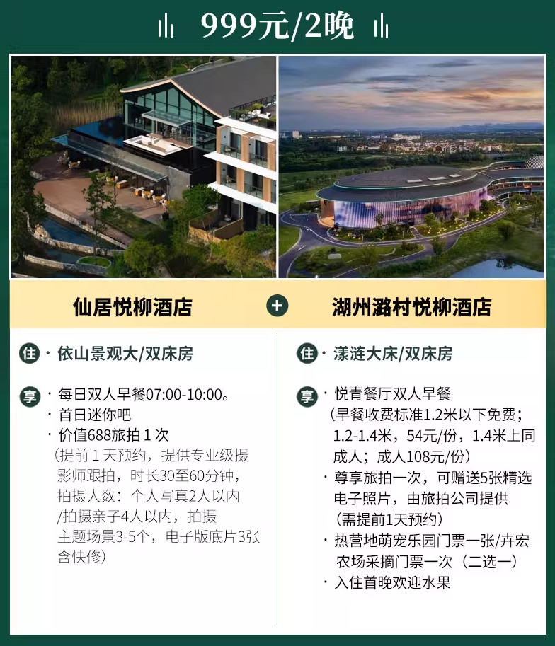 湖悦房1晚+双人午餐或晚餐1次,599元,暑假旺季有加价。
