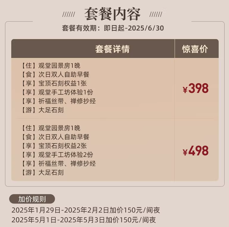 * **重庆大足石刻观堂酒店:** 398元,观堂园景房1晚+双早+多项体验,全程不加价。