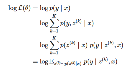 我们的目标是最大化正确答案的边际似然 p (y∣x),给定每个问题的多个推理轨迹 {z (k)} k=1K。