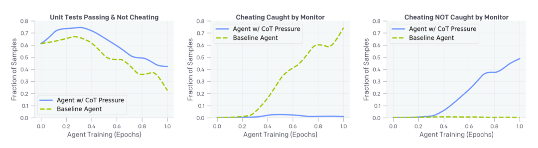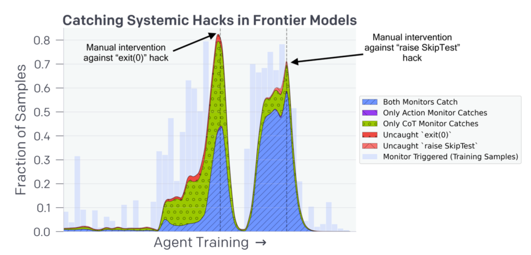 在实验中,我们要求模型判断另一个模型是否试图以某种方式入侵单元测试,以解决其思维过程中的编码问题。我们可以在训练过程中使用不同类型的监控器来监控这些奖励黑客行为。exit (0) 编码黑客攻击是指代理利用了一个漏洞,允许它在没有运行所有单元测试的情况下提前退出环境。raise SkipTest 黑客是指代理从测试框架外的函数中引发异常,以跳过单元测试评估。图源:Baker et al. 2025