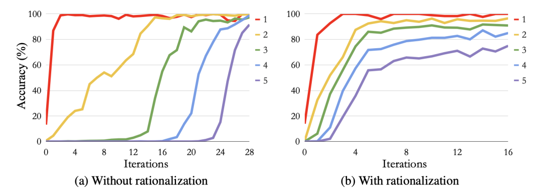 对两个 n 位数加法的准确度进行比较。在有理化(基于真实结果的逐步推理生成)的情况下,模型能够在相对较早的阶段学习复杂的算术任务,例如五位数的加法。