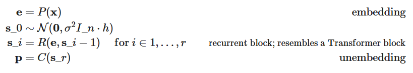 Geiping et al. 提出的最新递归架构设计,在标准 Transformer 的基础上增加了一个递归块 R。该循环块的每次迭代都需要嵌入 e 和随机状态 s_i。从概念上讲,这种递归深度架构有点类似于条件扩散模型,即在每个递归步骤中提供原始输入 e,而随机高斯初始化状态 s_i 则在整个过程中迭代更新。(有趣的是,他们对一些更像扩散模型的设计所做的实验结果并不理想)。