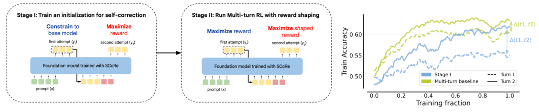 显式训练设置,通过进行两阶段 RL 训练来提高自我纠正能力。