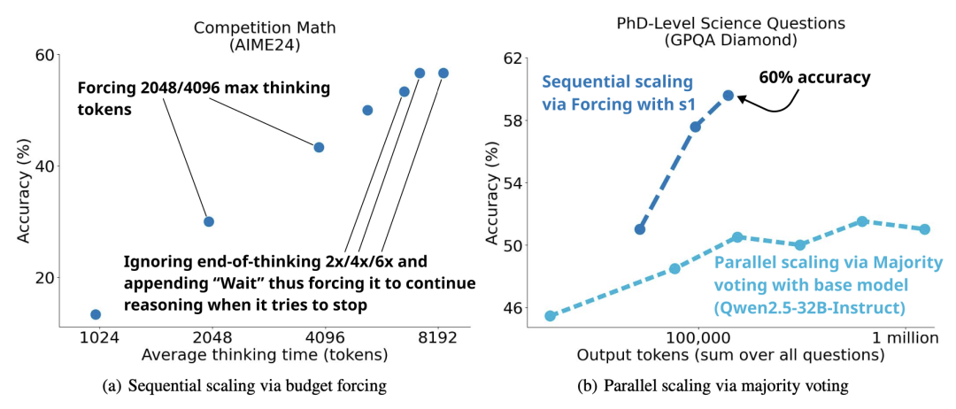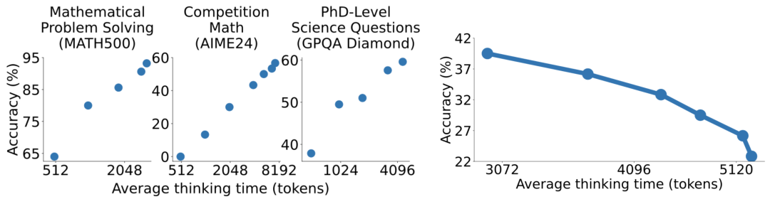 s1 模型通过预算强制(budget forcing)技术(即通过添加单词「wait」来强制延长思维,或通过添加思维结束 token 或「Final Answer:」来缩短模型的思考过程而终止)实验了思维链推理路径长度的扩展。他们观察到以 token 衡量的平均思维时间与下游评估准确率之间存在明显的正相关关系。