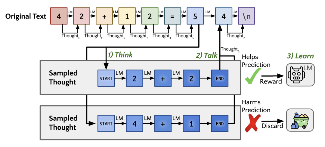 Quiet-STaR 通过训练模型在每个标记后生成理由来解释未来的文本,从而引入了标记级推理。它将未来文本预测与基本原理和无基本原理混合在一起,并使用学习来生成更好的基本原理,并使用 REINFORCE 来优化基本原理生成的质量。