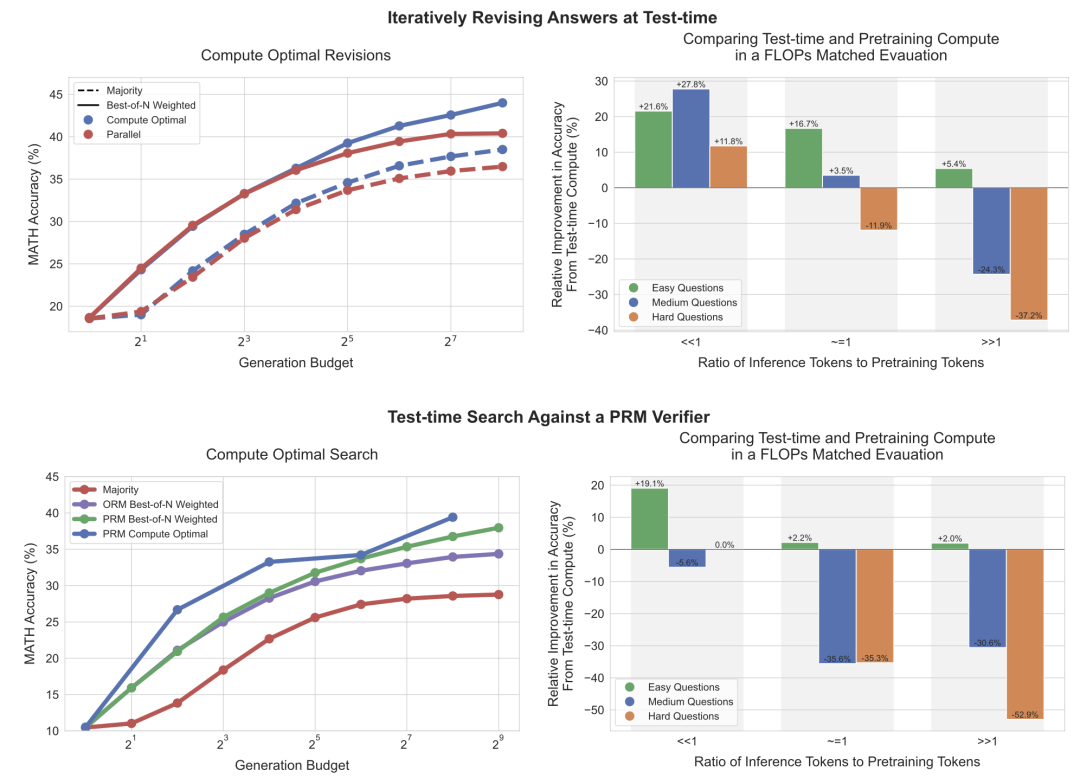 Snell et al. 评估并比较了测试时计算和预训练计算,发现它们并非 1:1 可互换的。当模型能力差距很小时,测试时计算可以轻松弥补简单和中等难度问题上的差距,但对困难问题的效果较差。预训练和推理的 token 预算比例非常重要。只有当推理 token 显著少于预训练 token 时,测试时计算才更有优势。这表明,利用充足的预训练数据和计算资源开发有能力的基础模型仍然至关重要,因为测试时计算无法解决所有问题或填补大的模型能力差距。