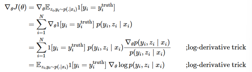 我们可以把 STaR 看作是 RL 中策略梯度的近似值,奖励是一个简单的指标函数𝟙1 [y^=y]。我们希望在对 z∼p (z∣x) 和 y∼p (y∣x,z) 进行采样时,最大化该奖励的期望值。