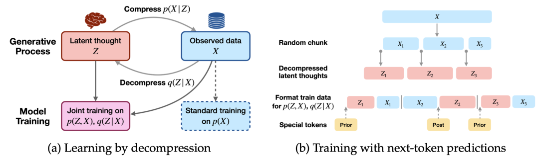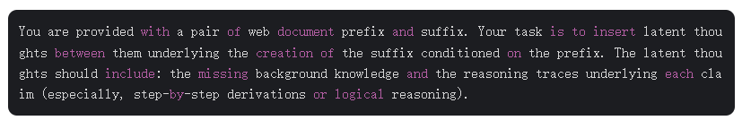 因为我们无法直接从潜变量分布 p (z∣x,y) 中采样,研究人员探索了依赖人工标注数据、Metropolis-Hastings MCMC 或具有特殊重要性权重的蒙特卡罗采样的方法来抽取好的思维链样本以更新模型。Ruan et al. (2025) 实验了在大量网络文本语料上使用 EM 算法训练带有潜在思维的模型,其中针对每个观察数据块合成潜在思维,然后模型以自回归方式在潜在思维和数据上学习。