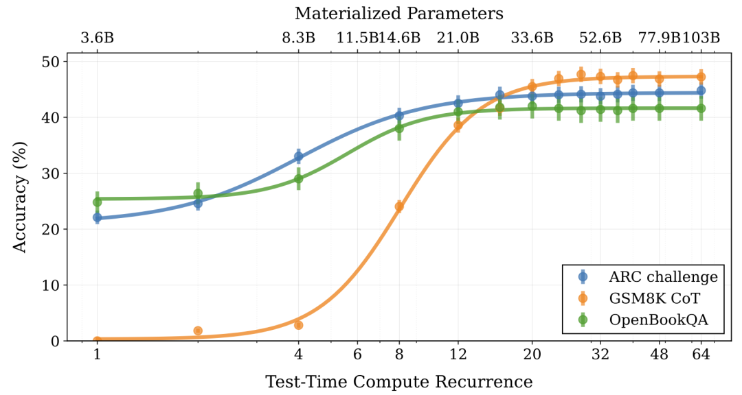 利用深度递推训练 3.5B 模型的实验图。饱和大致发生在 r¯=32 附近,这让我们不禁要问,这种结构如何外推并推广到更大的迭代次数。图源: Geiping et al. 2025