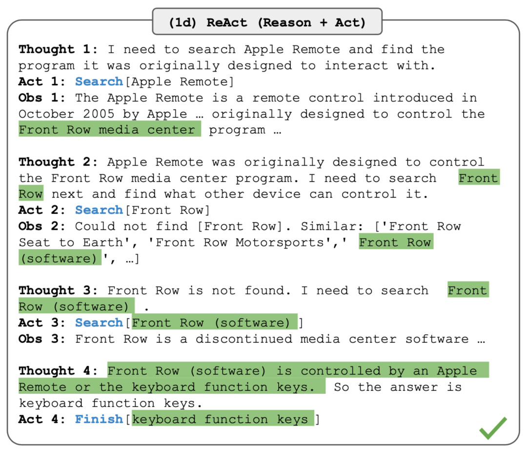 ReAct(Reason+Act,推理与行动)方法将调用 Wikipedia API 等外部操作与生成推理轨迹相结合,实现将外部知识纳入推理路径的能力。