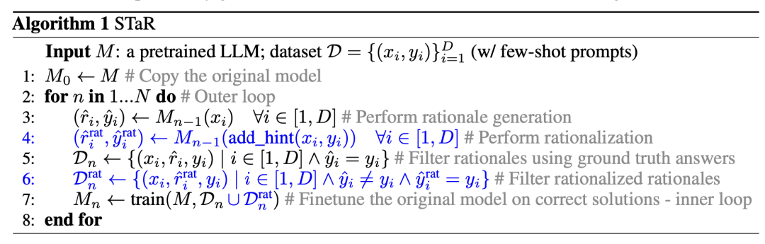 由于预训练模型已经具备了生成思维链的能力,因此我们可以直观地设计一个迭代改进过程,在这个过程中,我们会生成多个 CoTs,并只根据能得出正确答案的理由对模型进行微调。