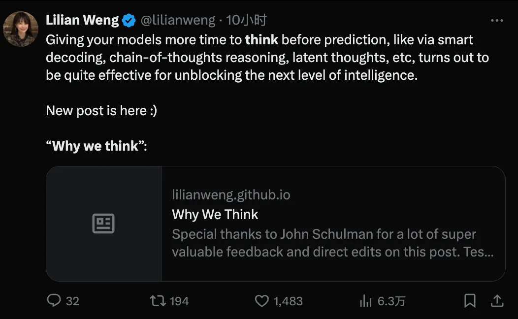 最近,北大校友、前 OpenAI 应用 AI 研究负责人 Lilian Weng 更新了一篇长长长长长长长博客《Why We Think》。