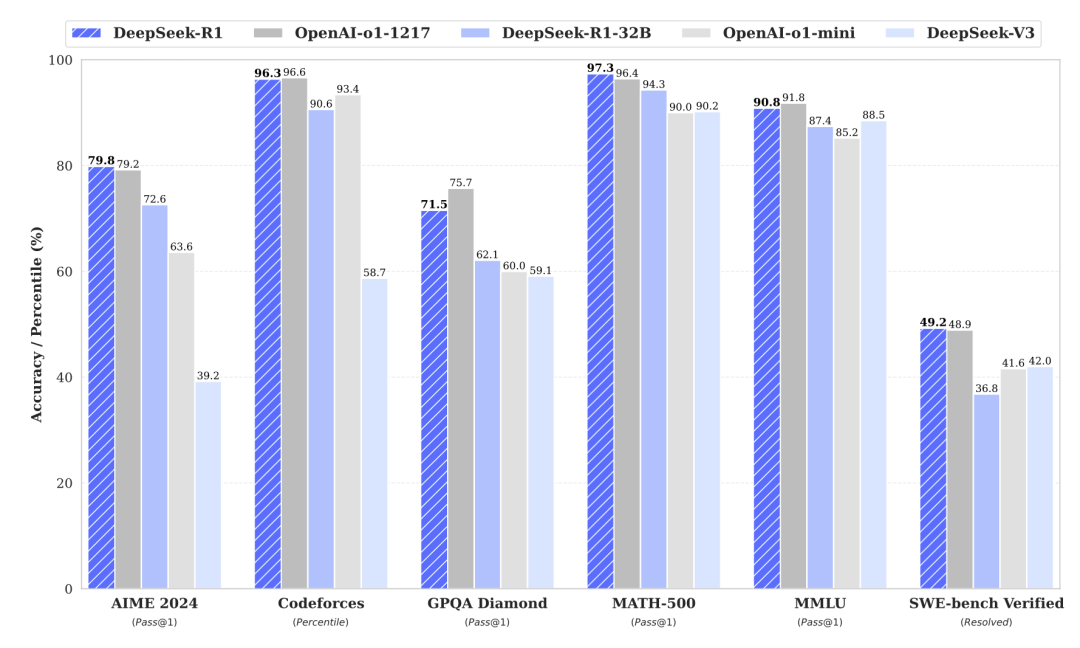 在多个广泛使用的推理基准测试中,DeepSeek-R1 的表现可与 OpenAI 模型相媲美。其中,仅有 DeepSeek-V3 是榜单中唯一的非推理类模型。