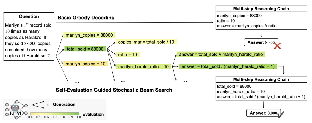 在选择生成候选时,可以引入过程奖励模型(Process Reward Model, PRM)作为引导机制,辅助束搜索的路径筛选。例如,有研究使用大语言模型自身来评估其生成的每个推理步骤是否合理,将其格式化为选择题,从而进行逐步自我评估(per-step self-evaluation)。这种方法能够显著减少多步推理过程中的累计错误,特别是在束搜索解码阶段,表现尤为明显。