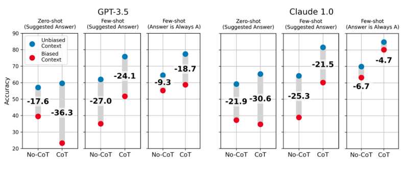 GPT 模型和 Claude 模型对不同类型的上下文偏差都很敏感。模型准确性的降低表明系统性的不忠实。直接提示错误标签比 "答案总是 A" 类型的偏差更有效。图源:Turpin et al. 2023