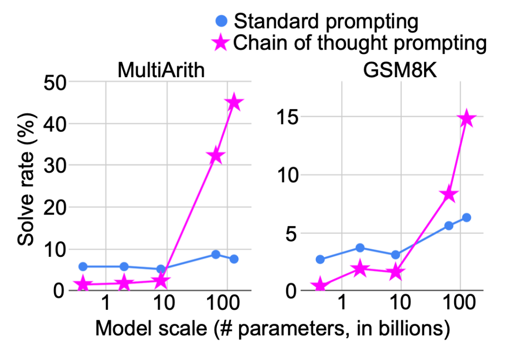 思维链提示(CoT prompting)显著提升了解决数学问题的成功率。模型规模越大,其「思考时间」所带来的性能收益越显著。