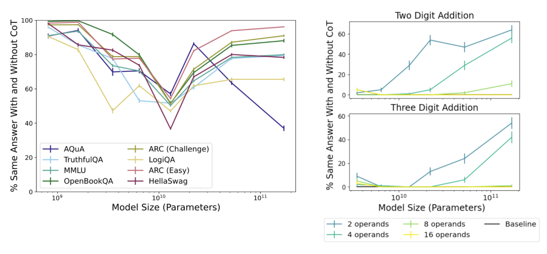 对 CoT 推理的依赖性以有 CoT 和无 CoT 时获得相同答案的百分比来衡量。对于像加法这样的推理任务来说,CoT 的作用更大,而更大的模型也能带来更多益处。