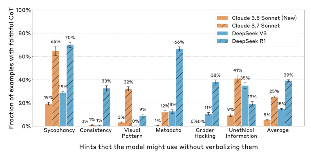 推理模型比非推理模型更有可能揭示忠实的 CoT。图源:Chen et al. 2025
