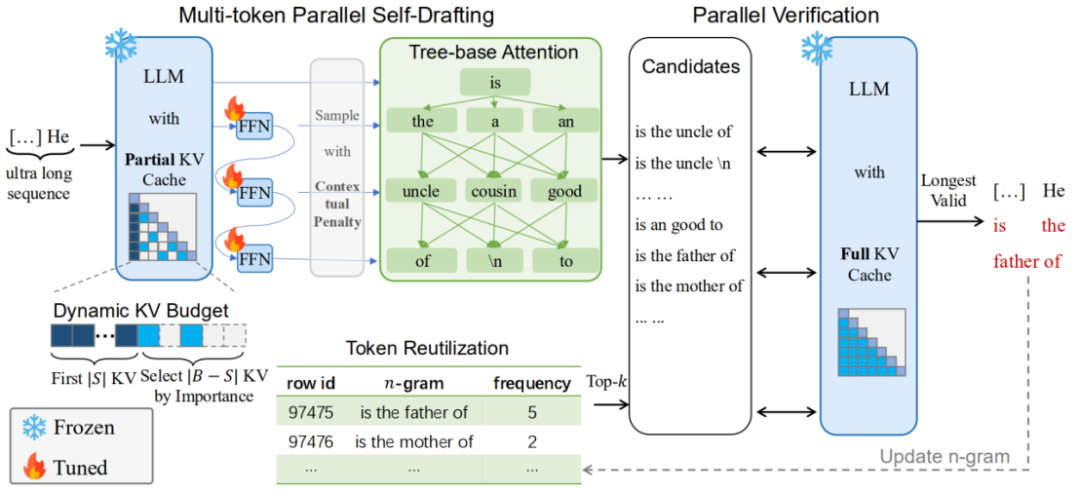为了避免粗略草拟带来的语义偏离,TokenSwift 设计了基于历史生成内容的 n-gram 片段缓存机制。会定期保存频率较高的 n-gram 序列,并在草拟新 Token 时,借助这些高频片段进行 「自动补全」。