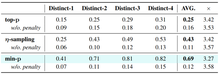 为了抑制超长生成中的机械复读,TokenSwift 采用了仅对最近 W Token 应用惩罚值 θ 的「上下文惩罚」机制。在与 top-p、η-sampling、min-p 等多种采样方法结合的实验中,未启用惩罚时 Distinct-n 平均值仅约 0.12;引入 θ=1.2、W=1024 后,平均多样性飙升至 0.43–0.69,同时加速比仅轻微下降~2–8% 左右,证明了该机制在保持质量一致性与提升文本多样性上的高效性 。