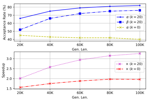 我们对比了禁用(k=0)与启用状态下的接受率和加速比。结果显示,未启用重用时,随着生成长度增长,接受率和加速比均出现明显下滑;而在 k=20 时,接受率不仅维持在 70–90% 的高水平,还随序列越长而略有提升,加速比亦从~2.1× 提升至~3.1×,凸显 Token 重用在减少模型重载和保持验证高效中的关键作用 。