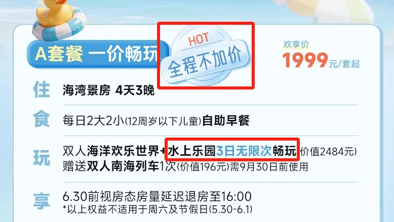 客房2晚可拆分+双早,599/699/799/899/999/1299元,有效期到9月底,全程不加价!