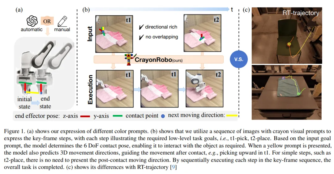 在机器人操作中,任务目标可以通过多种模态传达,例如自然语言、目标图像或目标视频。然而,自然语言往往存在歧义,而图像或视频则可能提供过于细节化的指令。为应对这些挑战,我们提出了 CrayonRobo ——一种以对象为中心、提示驱动的视觉-语言-动作模型,能够以简洁的方式明确表达低层级动作与高层级任务规划。