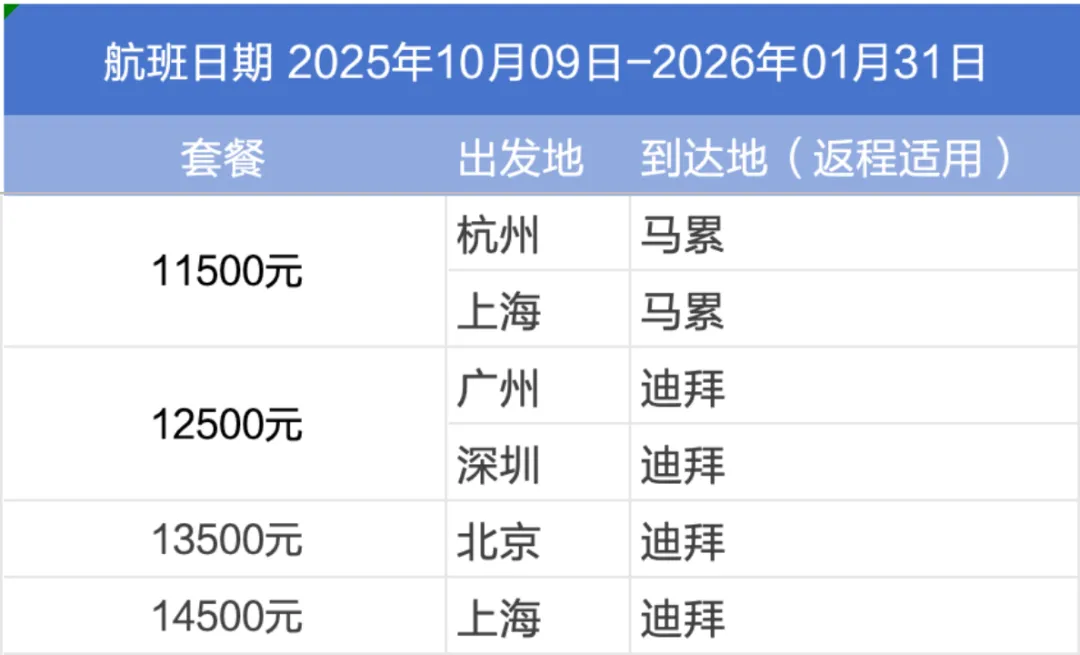 阿联酋航空公务舱往返套餐提供高端出行选择,覆盖2025年10月至2026年1月的黄金旅行时段。目的地迪拜、马尔代夫,特别适合长途飞行。
