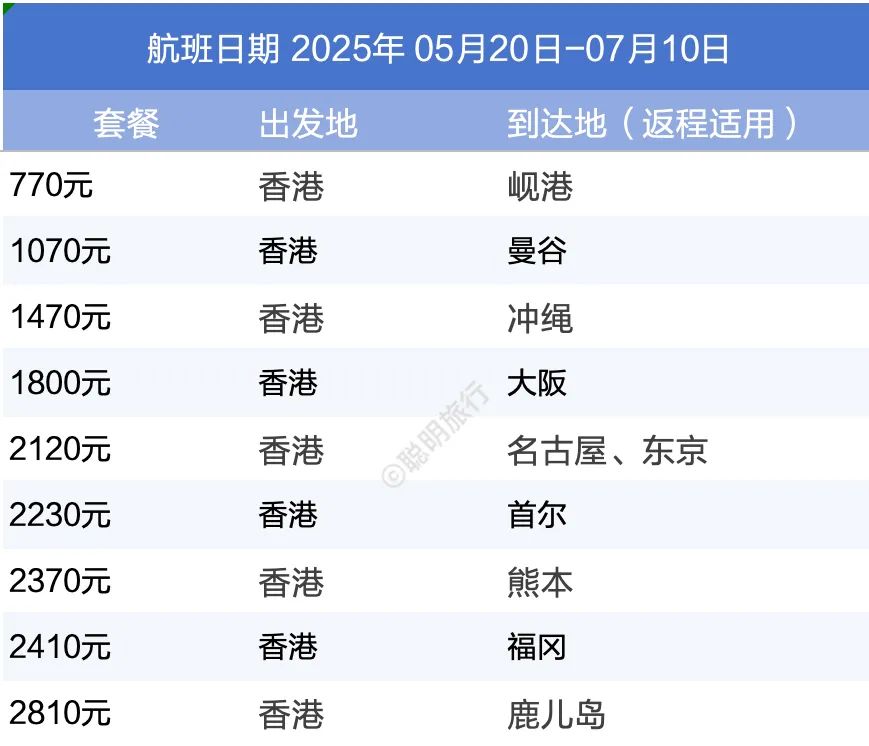 香港出发的双人往返机票卡覆盖5月20日至7月10日,正值初夏旅游旺季。