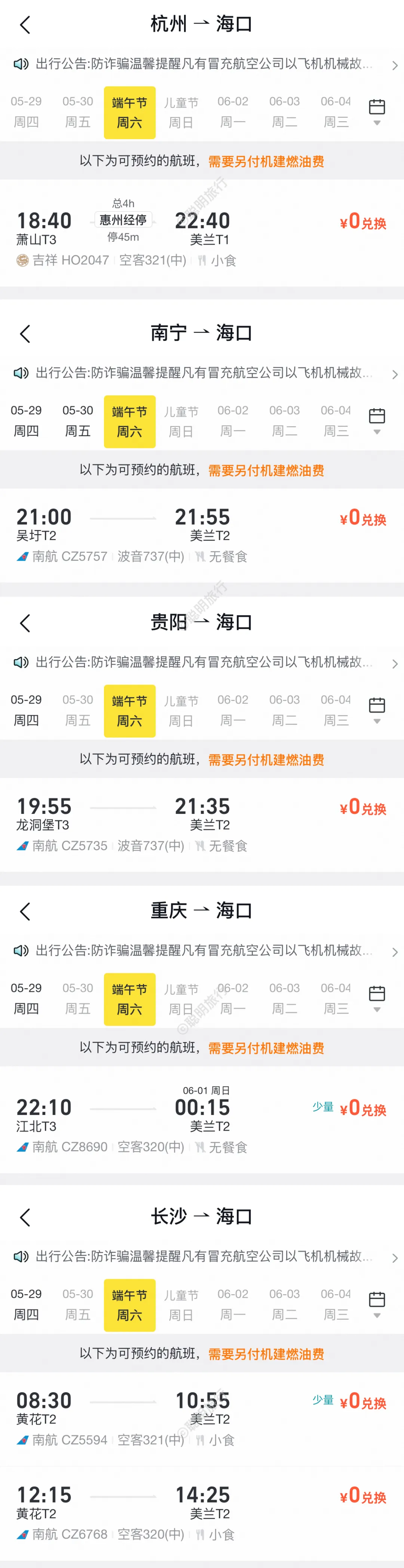 可以覆盖暑假的机票次卡,往返未含税。部分航线可以约到端午出发的航班,但是这个南航次卡的缺点是转机多、时间长,淡季出发还是得多对比日历票。