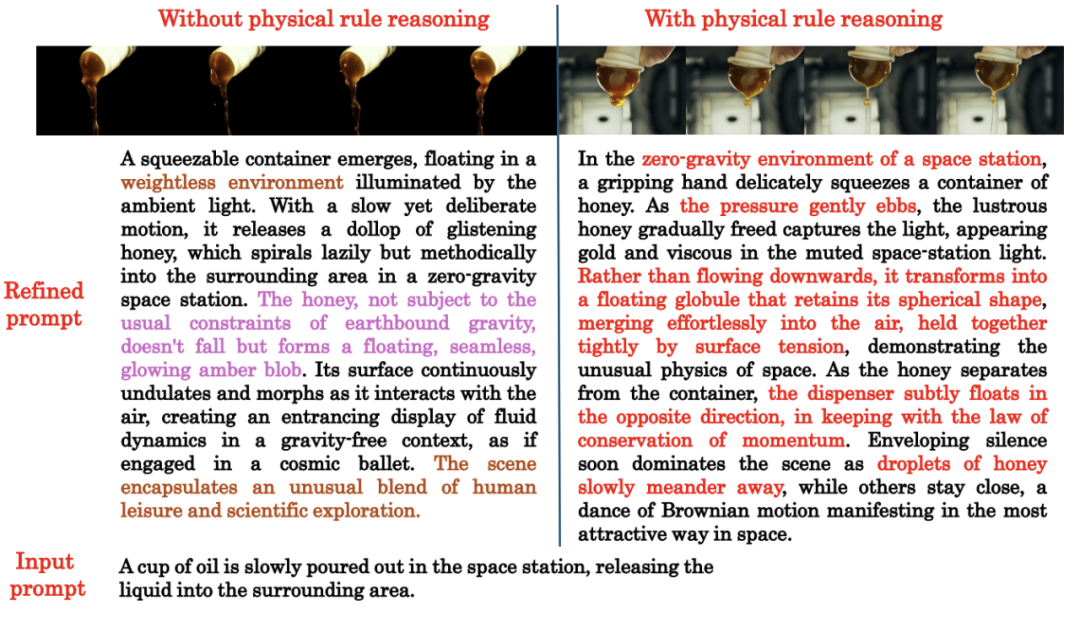现有提示增强方法的局限:虽然有研究表明通过细化提示可以改善分布外提示下的视频生成质量,但现有许多提示增强方法仅仅是基于主观经验简单地增强或修改提示,而缺乏一个有效的反馈机制来判断生成的视频在多大程度上偏离了现实世界知识和物理规则,以及当前的提示增强是否有效提升了视频的物理真实度。