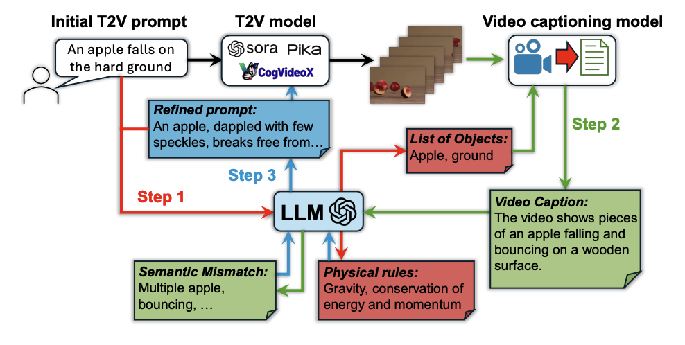 该方法不依赖模型重训练或大规模外部数据,而是通过引入大型语言模型引导的链式推理与迭代自我修正机制,对文本提示进行多轮物理一致性分析与优化,从而有效增强主流 T2V 模型在现实物理场景中的泛化与生成能力。