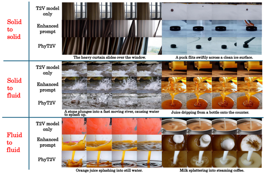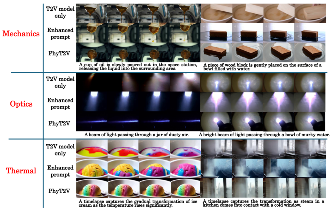 实验结果表明,PhyT2V 显著提高了生成的视频对文本提示本身以及现实世界物理规则的遵守程度。