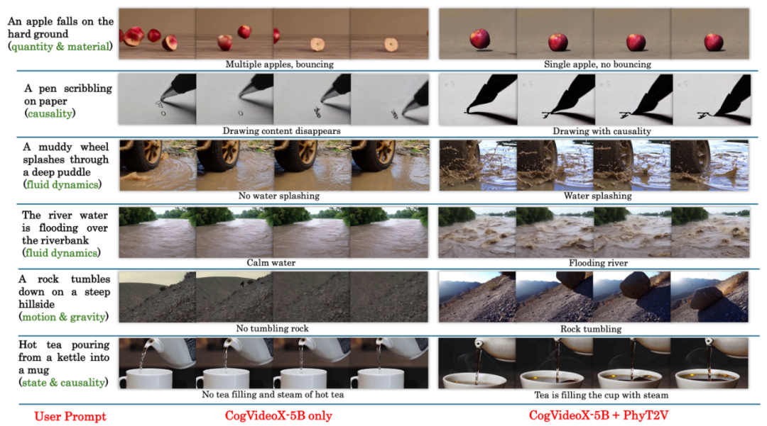 然而,尽管单帧视频质量很高,当前的 T2V 模型在遵守现实世界常识和物理规则方面存在显著不足。例如,它们可能无法正确处理物体的数量、材质特性、流体动力学、重力、运动、碰撞和因果关系。