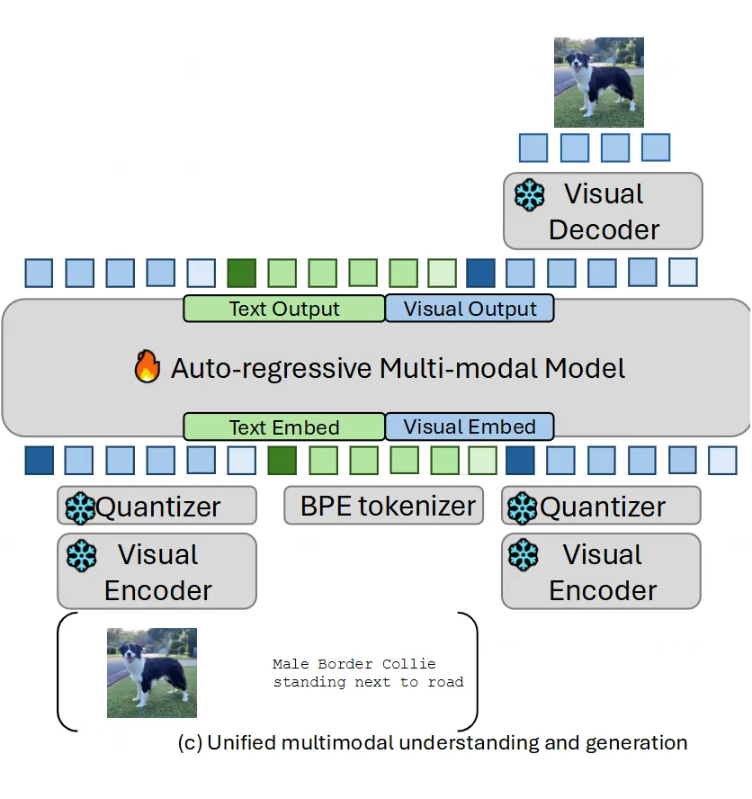 最后,把理解和生成的特征拼成一个多模态序列,扔给一个统一的自回归 Transformer 处理。LLM 自带一个预测头负责文本输出,另外还加了个随机初始化的图像预测头,专门管生成图片。整个模型是自回归的。