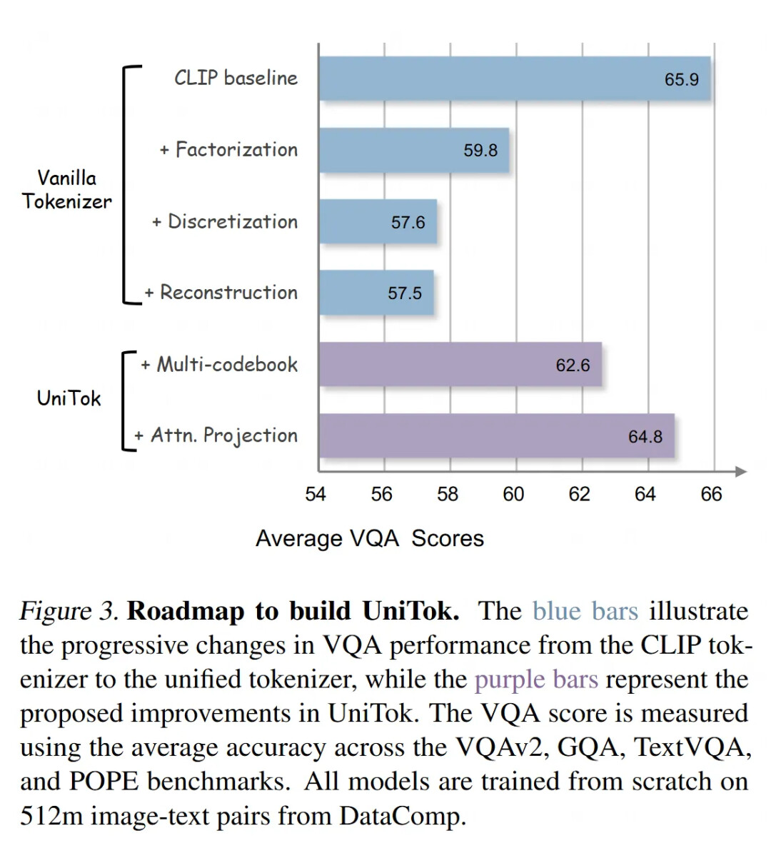 研究人员发现,虽然想法很好,但光是把这两个目标加起来训练,理解能力还是比不过专门的 CLIP,效果不太行。于是他们深入分析了从 CLIP 到这种统一 tokenizer 的过程中,到底是什么影响了性能(见下图 3 的分析过程):
